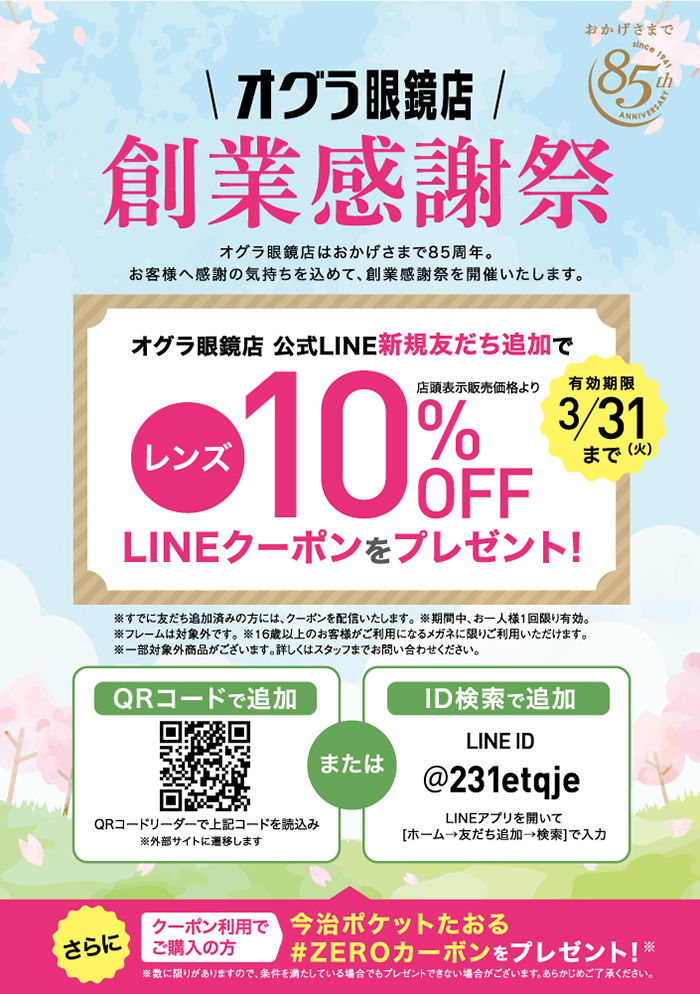 お客様への日頃の感謝を込めて、期間中、オグラ眼鏡店の公式LINEに新規友だち追加の方へ、メガネレンズ10%OFFクーポンをプレゼントいたします。