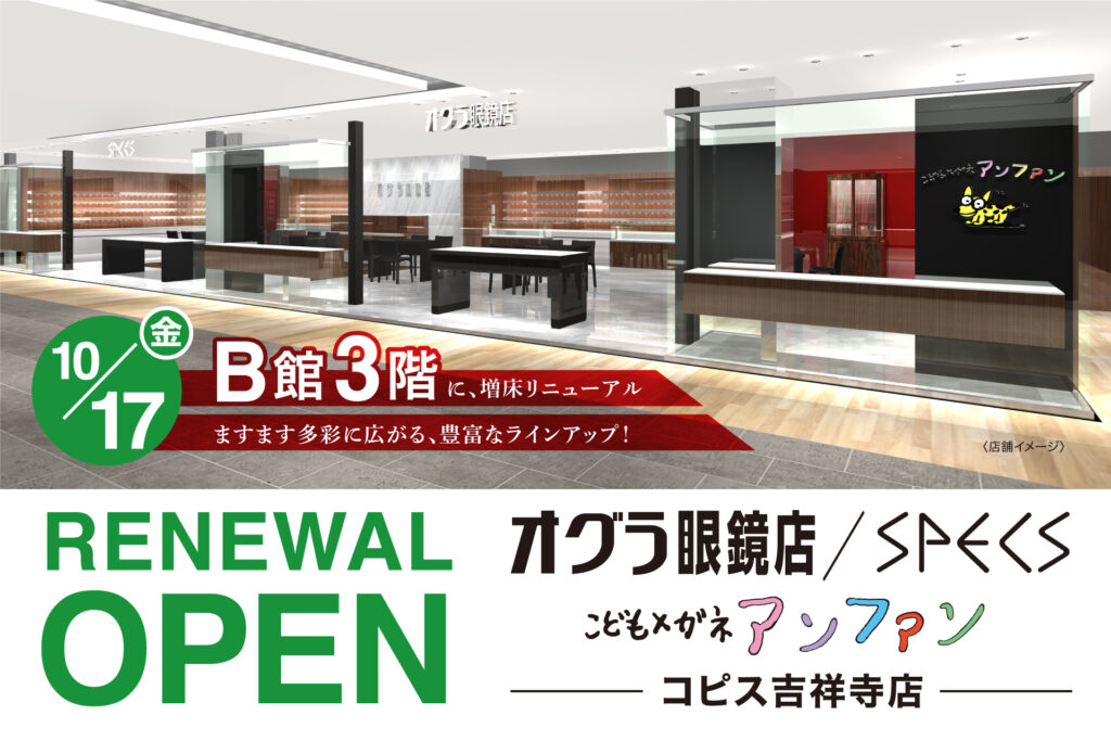10月17日(金)、「オグラ眼鏡店/SPECS コピス吉祥寺店」として、コピス吉祥寺B館3階に増床リニューアルオープンいたしました。