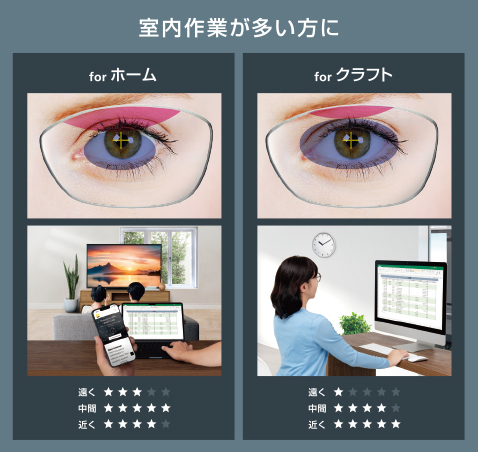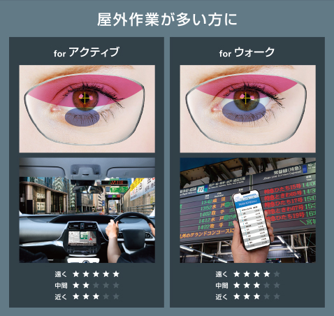 今迄よりも、暗い所でも明るくくっきり見える。目が疲れない。歩行しながら程度の屋外作業の場合は「ウォーク」で作成。遠方はもちろん、スマホも楽に見えるので快適。