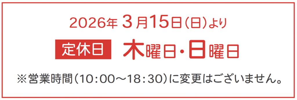 当店は2026年3月15日(日)より、現在の定休日に加え、日曜日も定休日とさせていただくことになりました。