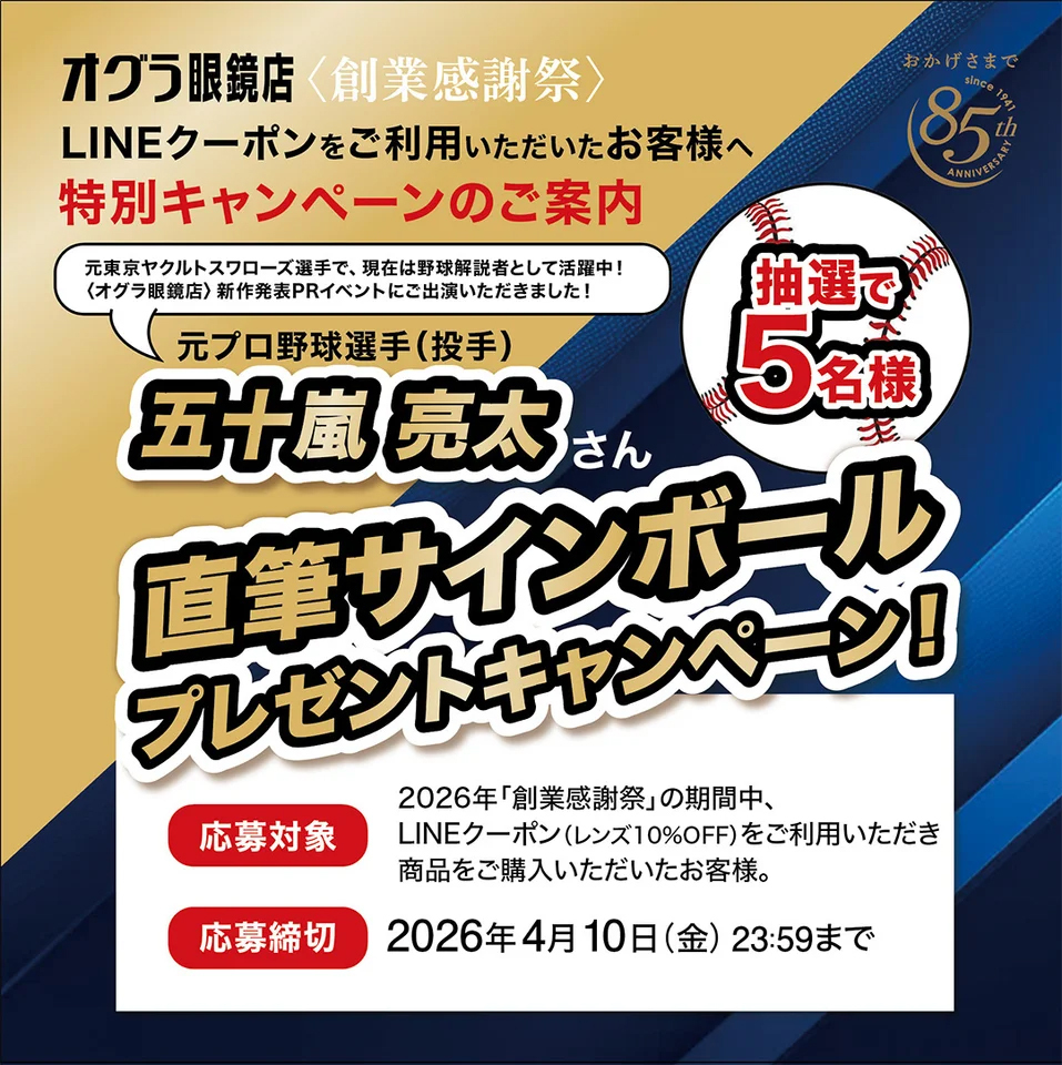 オグラ眼鏡店公式LINEに友だち追加すると、今ならメガネレンズが10%OFFになるクーポンをプレゼント!こちらのクーポンをご利用のうえメガネをご購入いただいたお客さまの中から抽選で5名様に、創業85周年記念イベントにご登場いただいた元ヤクルトスワローズ選手で、現在は野球解説者として活躍中の五十嵐亮太さんの直筆サインボールをプレゼントいたします。