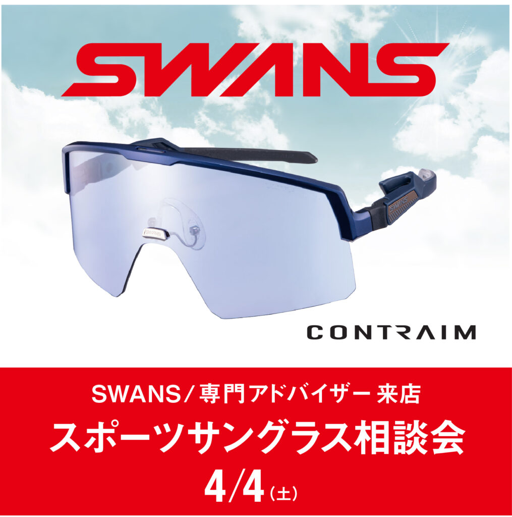 スポーツサングラスをお探しのお客様、ご相談承ります。 国産スポーツサングラスメーカー【SWANS】の商品を、各種ご用意しております。当日は【SWANS】から専門アドバイザーも来店!【SWANS】の新作サングラス「CONTRAIM」を実際にお試しいただき、先行受注も承ります。